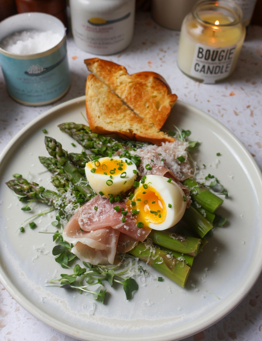 - Arrange the asparagus on a bed of rocket sprouts. Drizzle with the sauce, then top with prosciutto slices, grated Parmesan, halved soft-boiled eggs and chopped fresh chives. Serve with toasted brioche.