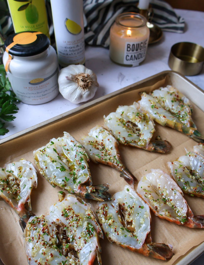 - Cut the shrimp in half lengthwise, without cutting all the way through, then carefully open them into butterfly shrimp.