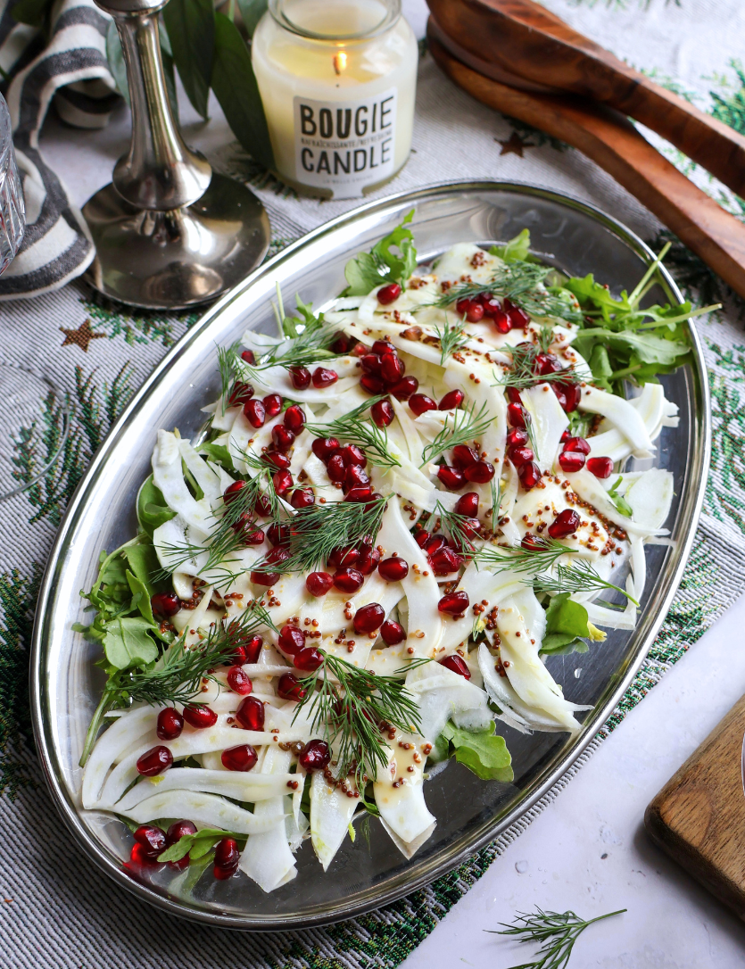 - Arrange the arugula and fennel on a plate. Drizzle with the vinaigrette, then garnish with pomegranate arils and fresh dill.