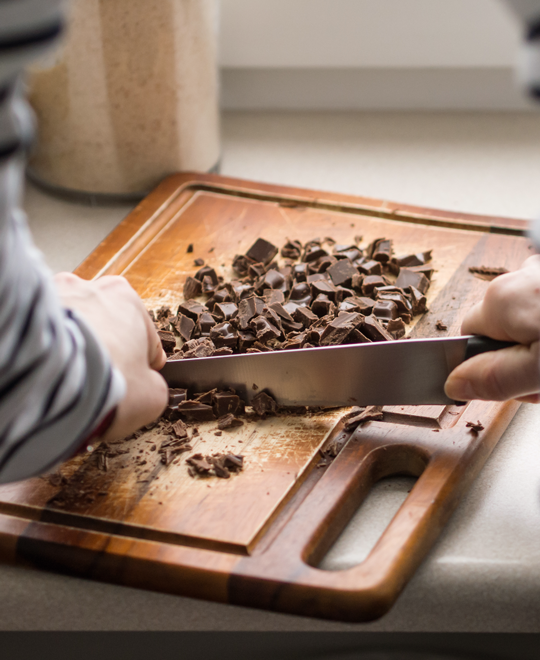 - Melt the dark chocolate in a saucepan over a pot filled with simmering water. Grate the white chocolate.