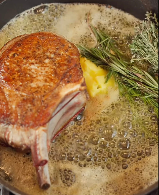 - Pat the pork chops dry with paper towels. Season both sides generously with salt and pepper. Heat a large oven-safe skillet over medium-high heat. Add olive oil to the skillet and sear the pork chops until golden brown on both sides, about 3-4 minutes per side. Add butter, minced garlic, rosemary, and thyme to the skillet. Baste the pork chops with the melted butter and aromatics.
