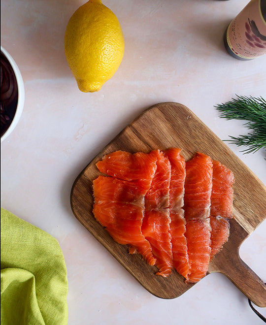 - Garnish the latke with arugula, smoked salmon, pickled onions, eggs, crème fraîche and dill. Serve with a drizzle of olive oil and lemon wedges.