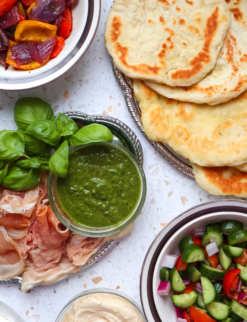 - Prepare all toppings and let everyone build their own flatbread. Spread with hummus, pesto, or yogurt.