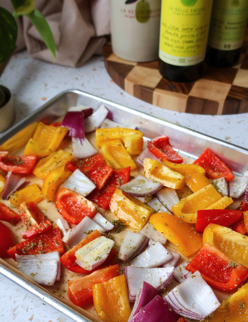- Spread the bell peppers and red onion on a baking sheet. Drizzle with olive oil and white balsamic vinegar, sprinkle with dried oregano, season with salt and pepper, and roast for 12–15 minutes.
