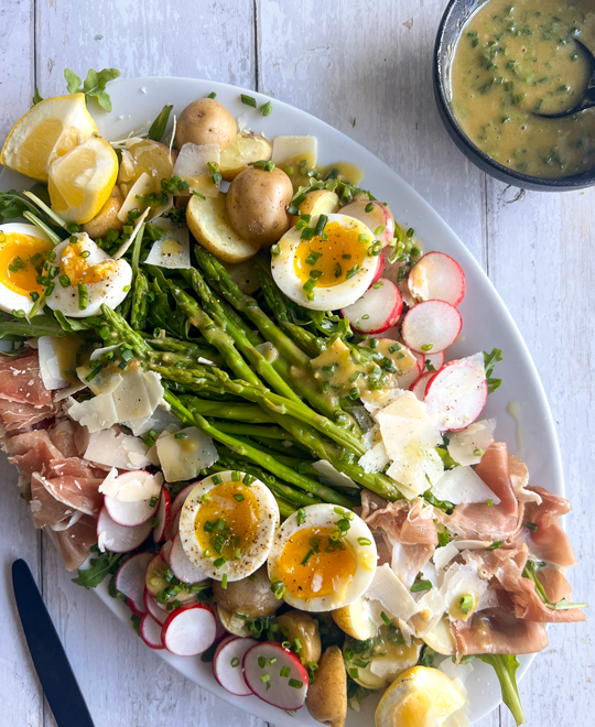 - To assemble the salad, add the arugula to the bottom of a plate. Add the potatoes, asparagus, radishes, prosciutto, parmesan shavings and hard-boiled eggs. Add mustard sauce. Finish with a drizzle of olive oil and a little more chopped chives.