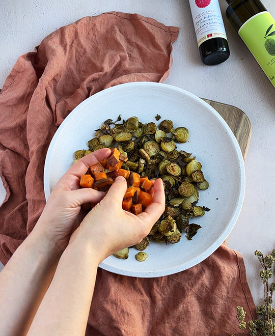- In a large bowl, toss Brussels sprouts and sweet potato cubes with a drizzle of olive oil.