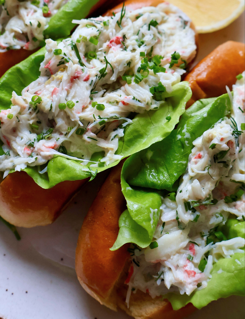 - Place a few Boston lettuce leaves inside each toasted roll, then generously fill with the crab mixture.