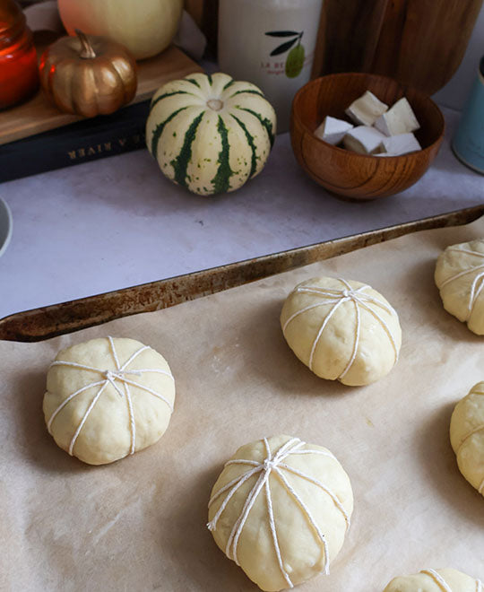 - Wrap the twine around the dough balls. Begin wrapping once, then twist the twine underneath at a 90-degree angle to form a cross. Wrap two more times to create 8 spaces around the twine.