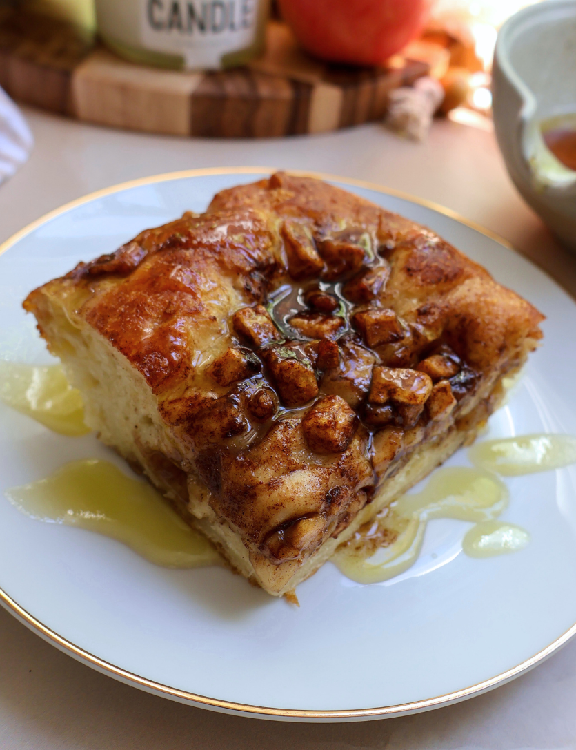 - Transférer la pâte dans un moule rectangulaire huilé. L’étaler avec les doigts. Ajouter la moitié des pommes au centre, replier la pâte pour enfermer la garniture, puis retourner délicatement (coutures en dessous).