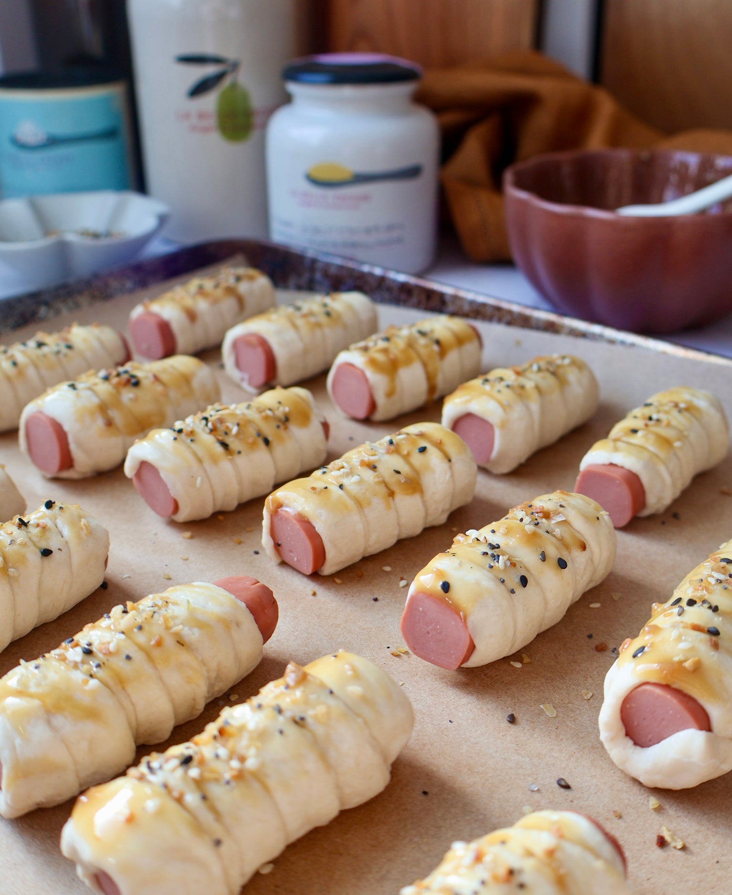 - Enrouler chaque morceau de saucisse dans une languette de pâte feuilletée.