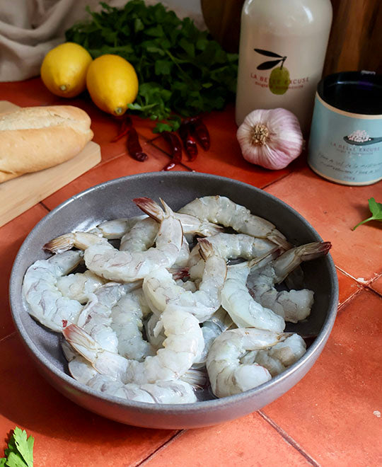 - 1 livre de grosses crevettes, crues et décortiquées, avec la queue