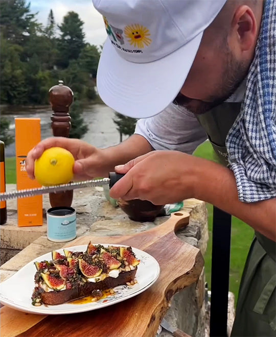- Étaler la ricotta fraîche sur le pain au levain grillé. Placer les quartiers de figues sur la ricotta pour couvrir tout le pain. Assaisonner avec la vinaigrette au chorizo, saler et poivrer.