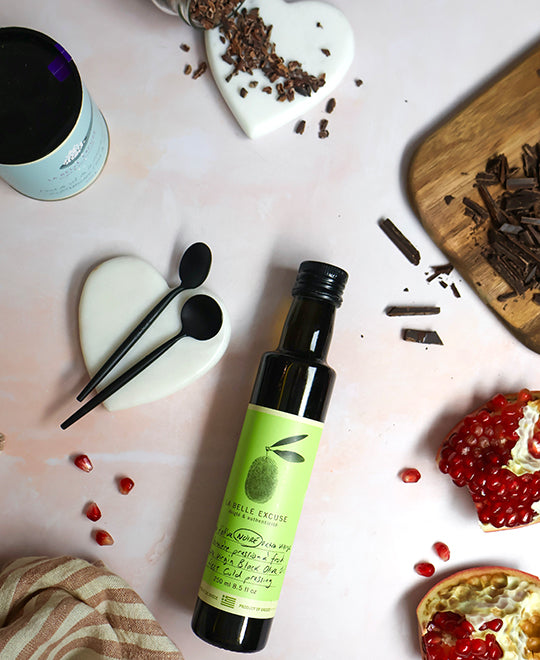 4. Garnir avec quelques goutes d’huile d‘olive, la crème fouettée, les arilles de grenade, les pépites de cacao et une pincée de fleur de sel.