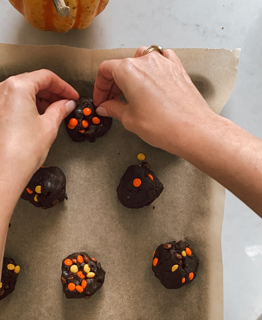 À l'aide de vos mains, former des boules de pâte de la taille d'une cuillère à soupe sur les plaques à pâtisserie préparées, en les espaçant d'au moins 2 pouces. Parsemer les boules de pâte à biscuits de Reese's supplémentaires et de petits yeux en bonbons.