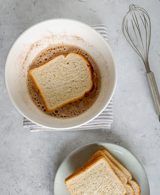 - Battre les œufs dans un bol avec le sucre. Ajoutez le lait et le restant de cannelle. Bien mélanger jusqu’à l’obtention d’une préparation mousseuse. Trempez les tranches de pain dans ce mélange puis égouttez-les.