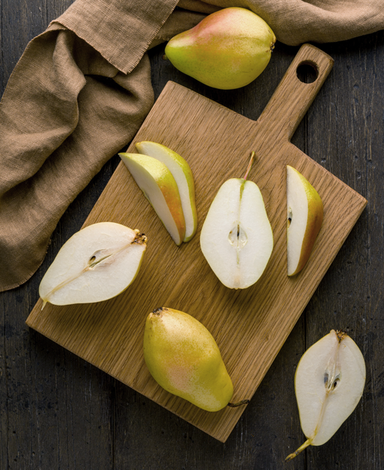 - Lavez et épluchez les poires. Coupez-les en quartiers. À feu doux, faites revenir dans une poêle avec 1 c. à soupe d’huile d’olive jusqu’à légère coloration.