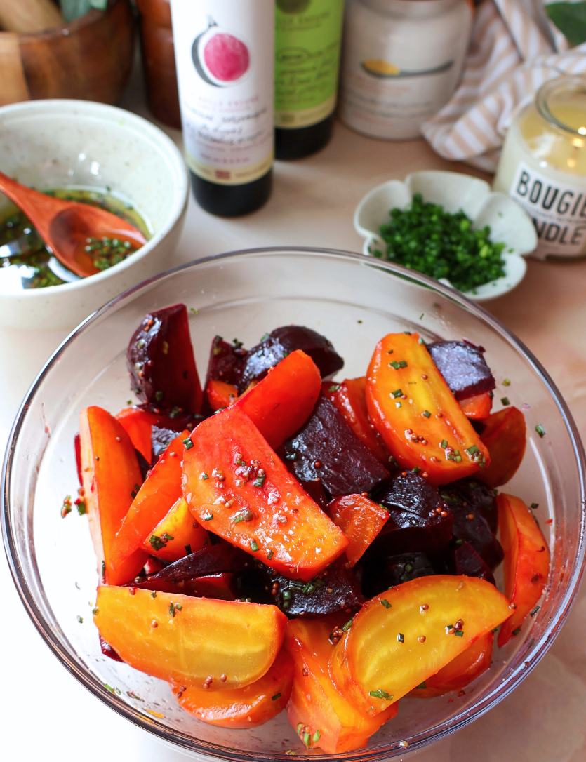 - Laver les betteraves et les enrober d’un filet d’huile d’olive. Saler légèrement. Envelopper séparément les betteraves rouges et jaunes dans du papier aluminium (ou parchemin). Déposer sur une plaque et rôtir au four pendant environ 1 heure, ou jusqu’à ce qu’elles soient tendres.