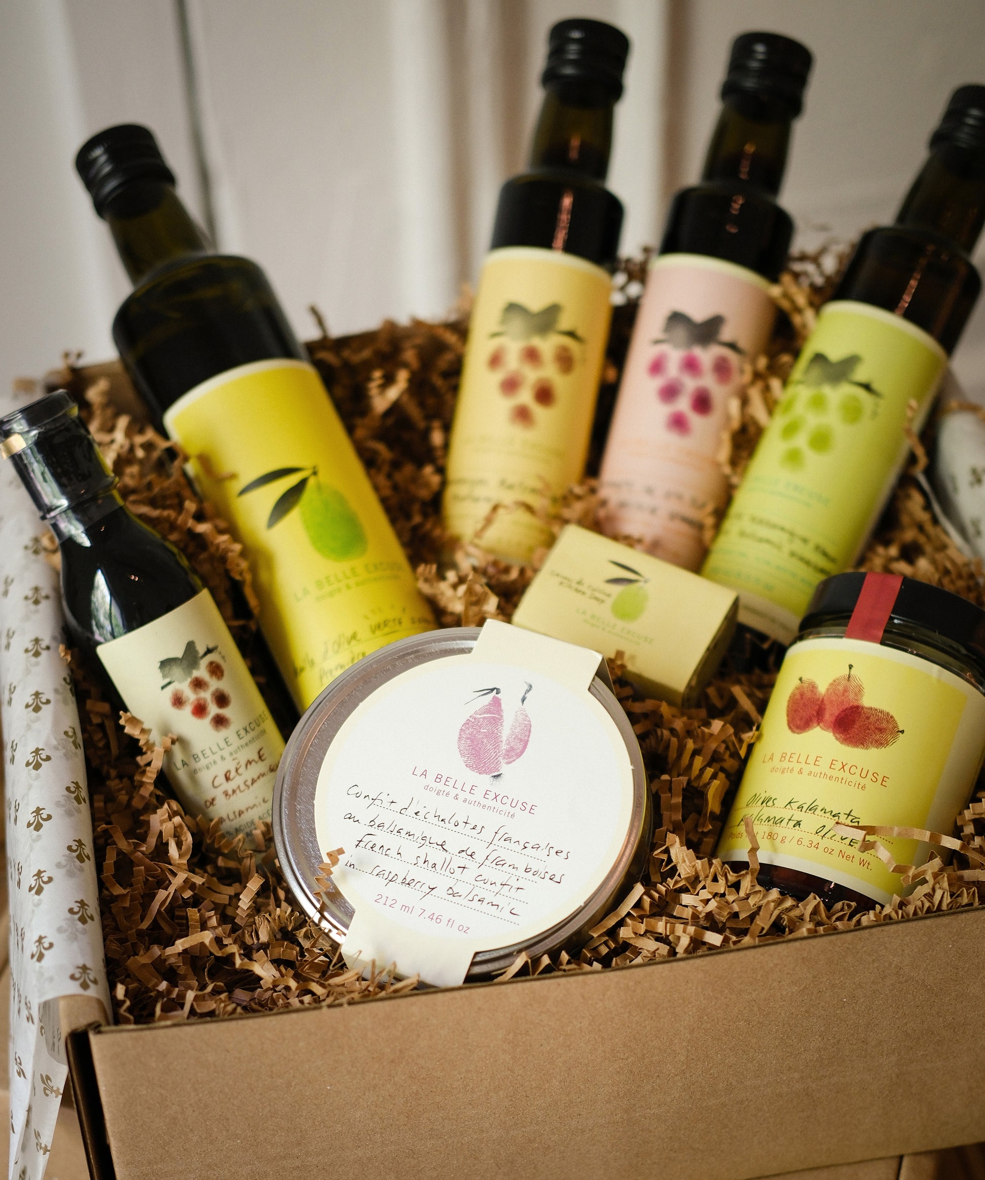 Contains all the basics: green extra-virgin olive oil (500 ml), traditional balsamic vinegar (250 ml), white balsamic vinegar (250 ml), Lambrusco red wine vinegar (250 ml), balsamic glaze (220 g), raspberry French shallot confit (212 ml), kitchen soap lemon,coffee, rosemary (65gr) and succulent Kalamata olives (475 ml).