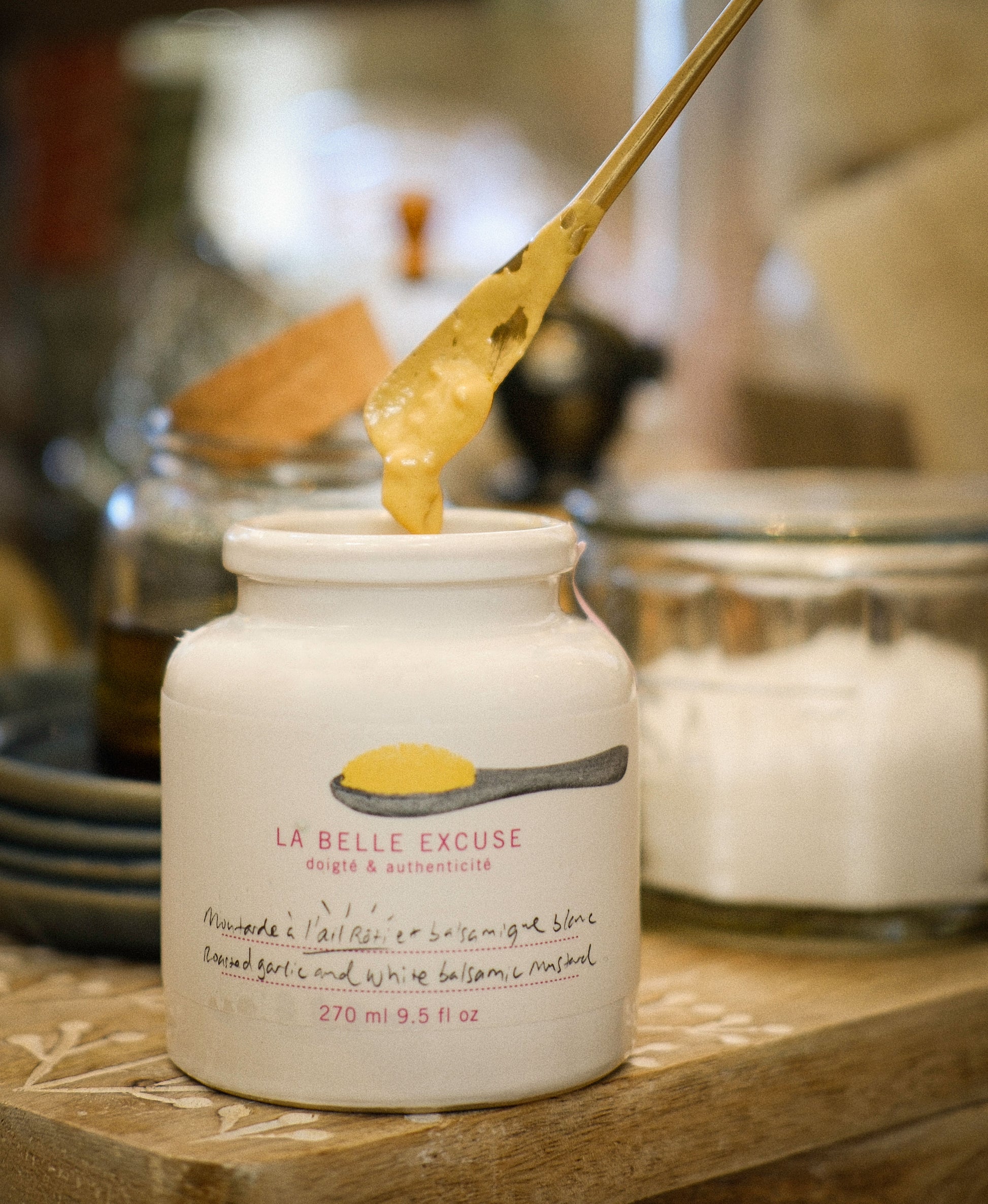 LA BELLE EXCUSE offers you a tasty mustard with olive oil, roasted garlic, and white balsamic vinegar. Emulsified with La Belle Excuse green olive oil, this delicious mustard has a rich creamy texture, enhanced by the subtle aroma of roasted garlic and the tangy sweetness of white balsamic vinegar. A natural artisanal mustard to liven up all your favorite dishes! Your taste buds and guests will be delighted. Its appetizing name also happens to be the entire list of ingredients :-)