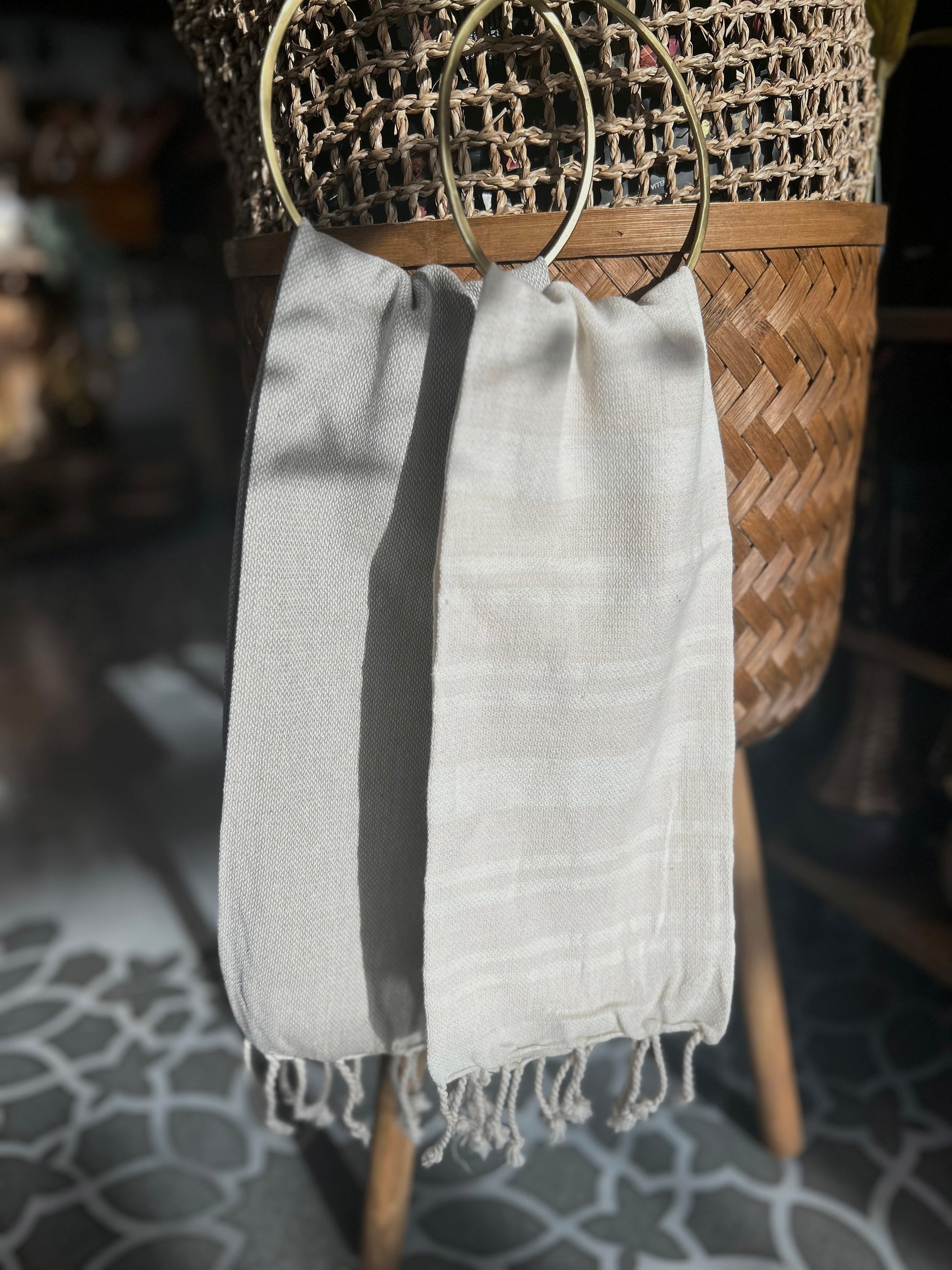 This boho inspired set of tea towels features soft woven cotton adorned with decorative fringe.